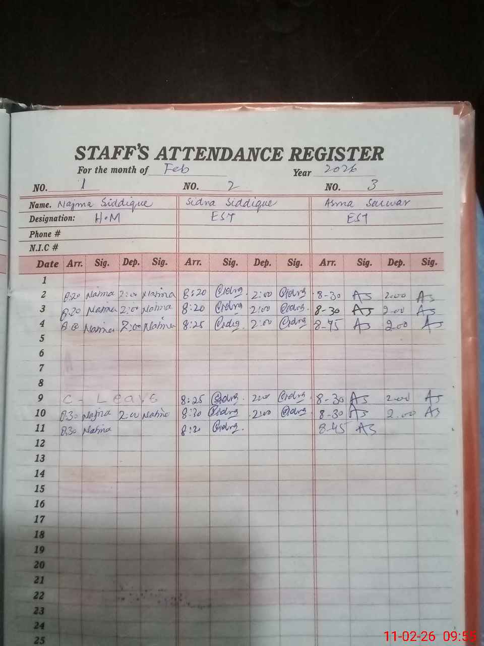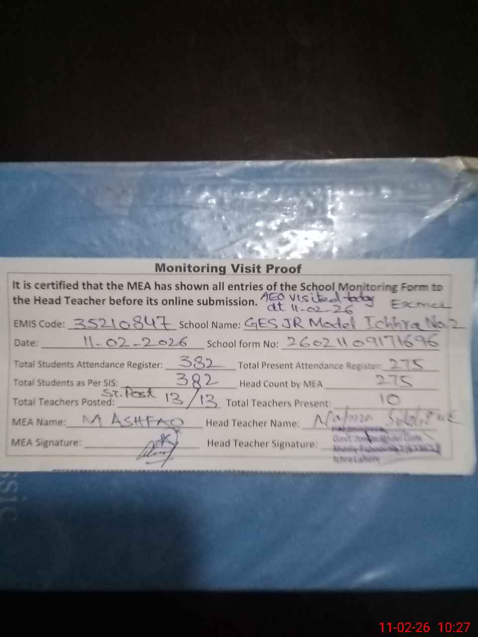 | Remarks (Use Separate Page if Required): AEO Safana visited this school today dt 11-02-26 EST Maryam Akram attached with GGPS Ali Garh but her latest orders not available so mark him absent 35210847 | |||||