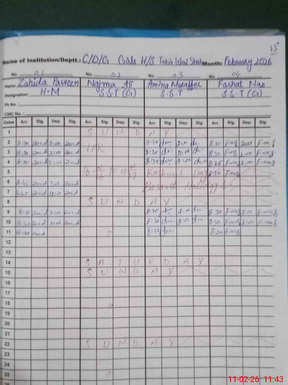 | Remarks (Use Separate Page if Required): Sweeper Alishah absent since 09-02-2026 FTF Bank statement missing PST Asia Mukhtar and PST Sadia Riaz transfered since 20-05-2021 but their names still shown on SIS No administration visit for long time 35210828 | |||||