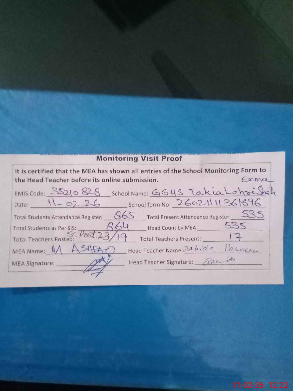| EMIS Code: 35210828 | Name of School: GGHS TAKIA LEHRI SHAH (EX-MCL) | |||