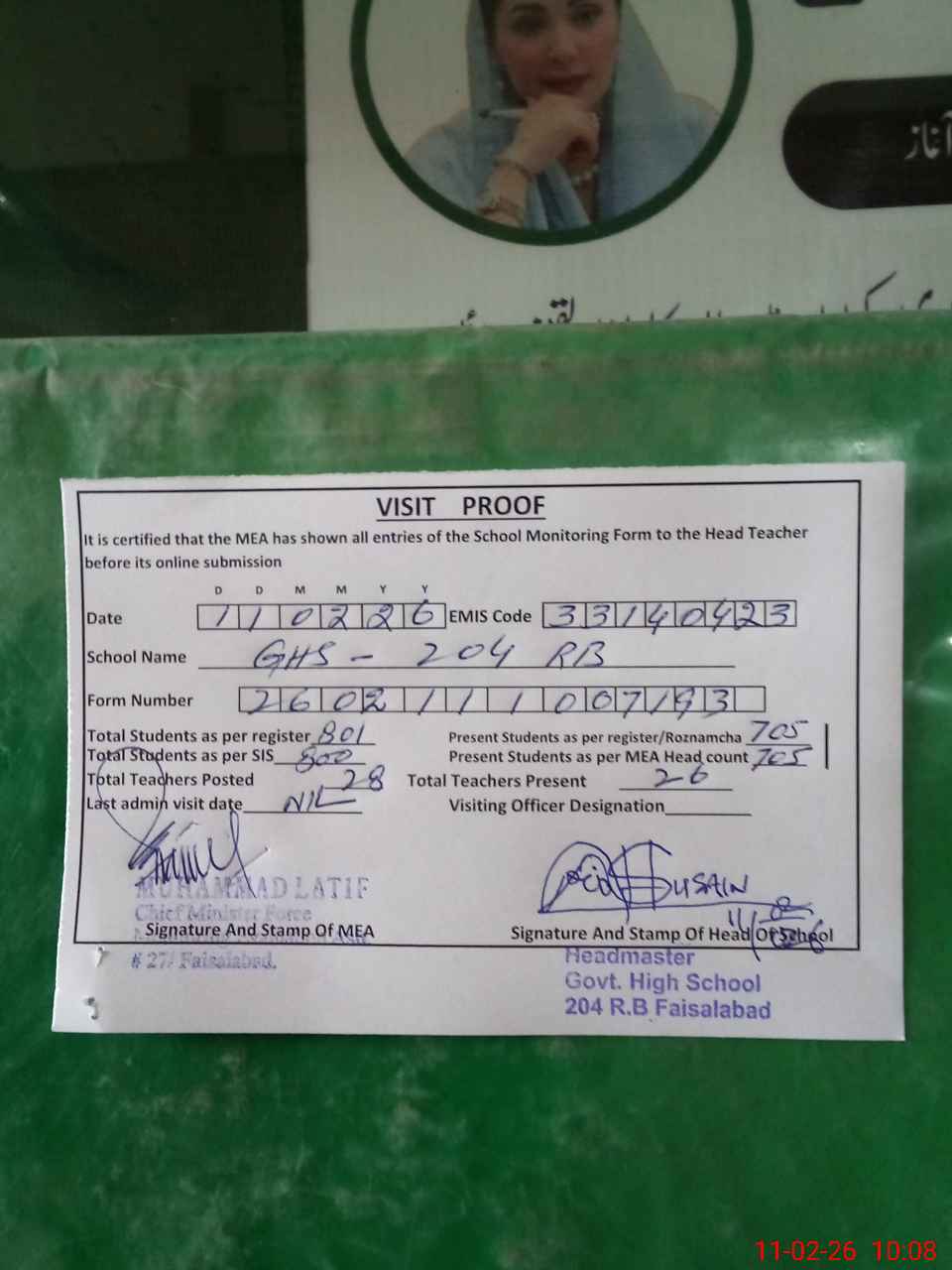 | Attendance Register | Head Teacher | MEA with School | Visit Proof |