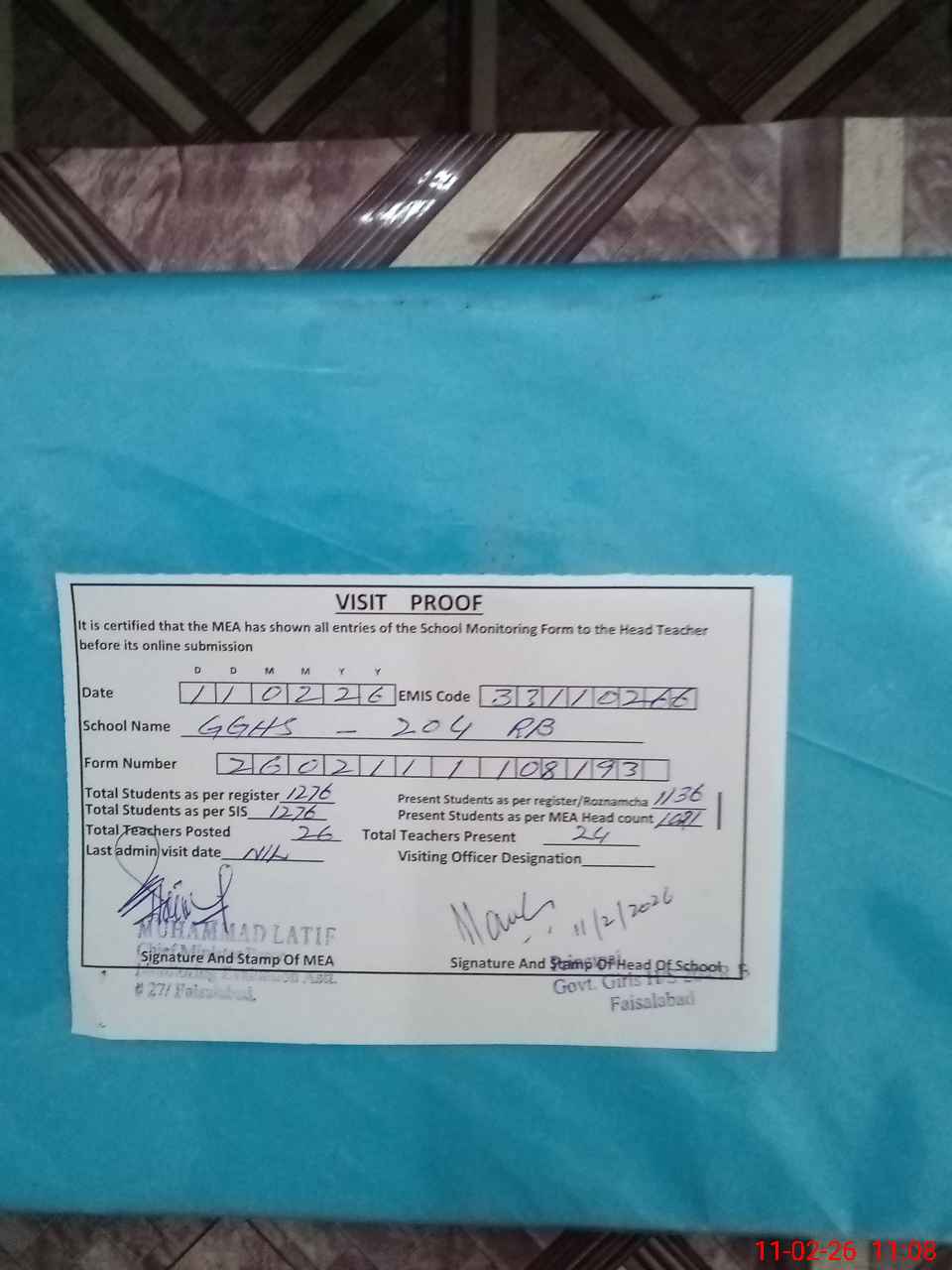 | Attendance Register | Head Teacher | MEA with School | Visit Proof |