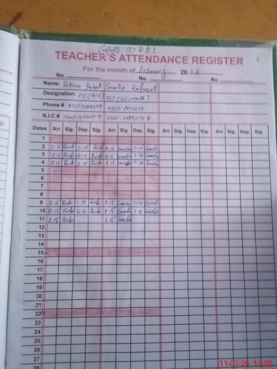 | Name: RO**** IQ**** Designation: (School Headmaster's/Headmistress's) PTC/JV Phone/Cell Number: 03**** |