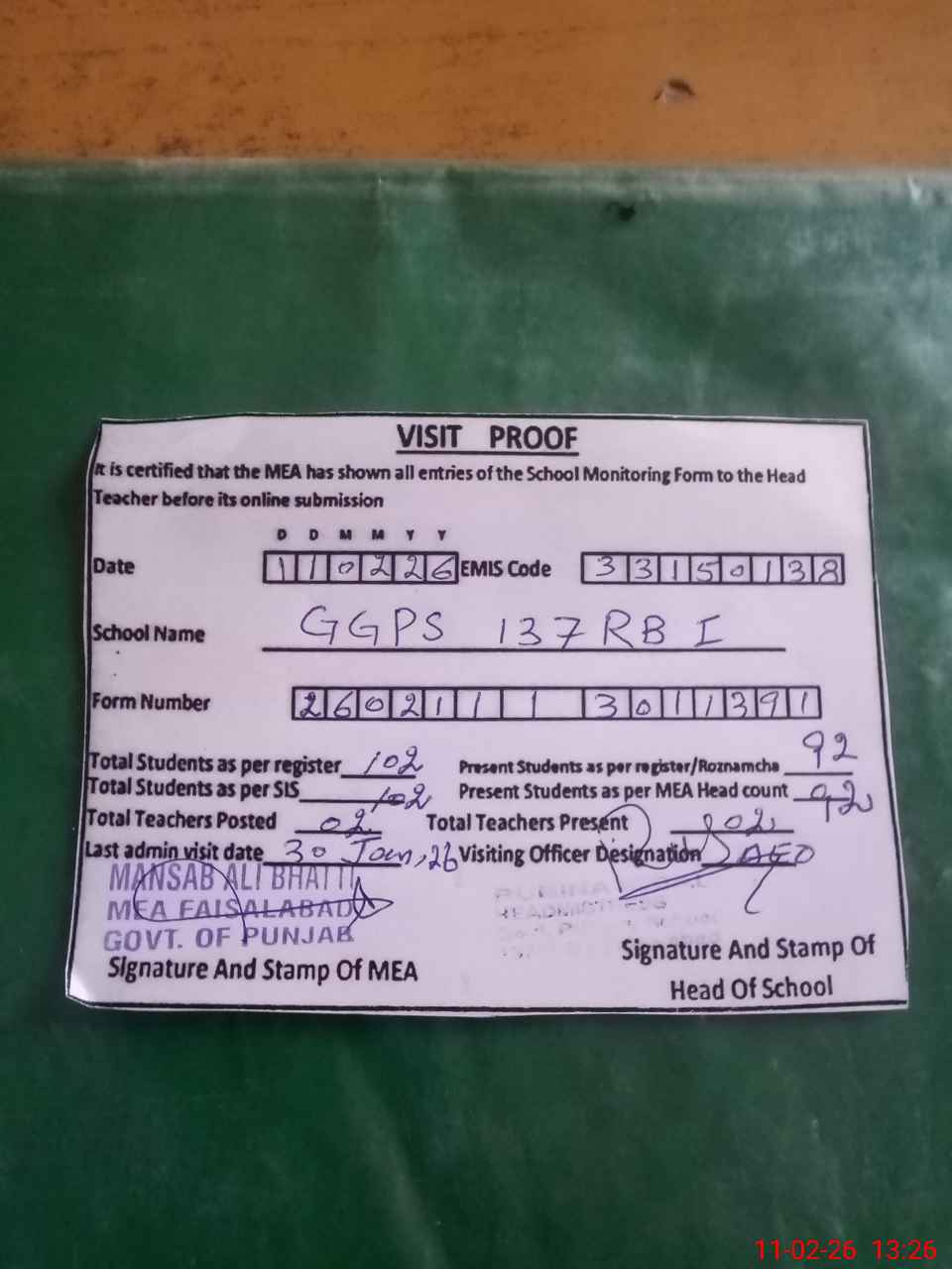 | Monitoring Date: 11-02-2026 | Start Time: 11-02-2026 12:43 PM | End Time: 11-02-2026 01:40 PM | Name of MEA: Ma**** Al**** | |