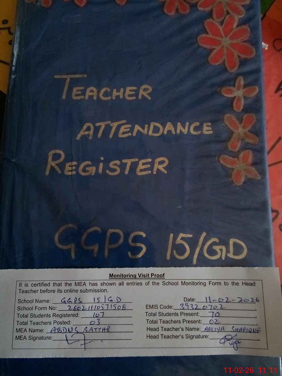 | Attendance Register | Head Teacher | MEA with School | Visit Proof |