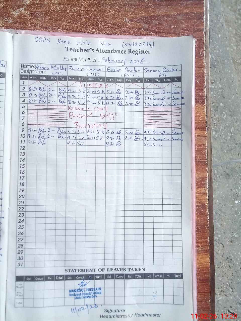 | Monitoring Date: 11-02-2026 | Start Time: 11-02-2026 10:13 AM | End Time: 11-02-2026 10:53 AM | Name of MEA: MA**** HU**** | |