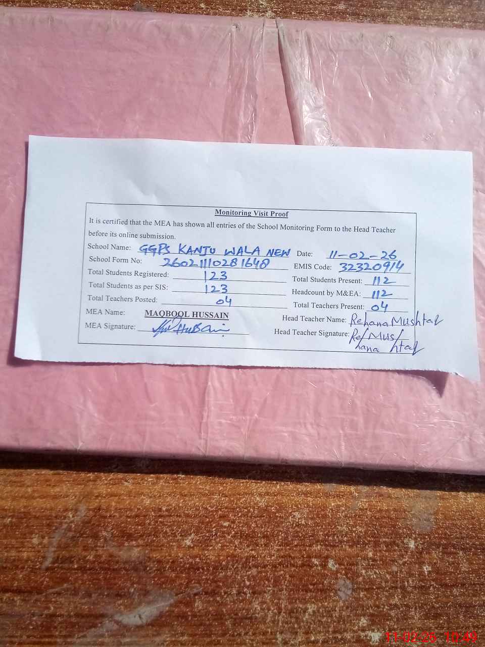| Attendance Register | Head Teacher | MEA with School | Visit Proof |