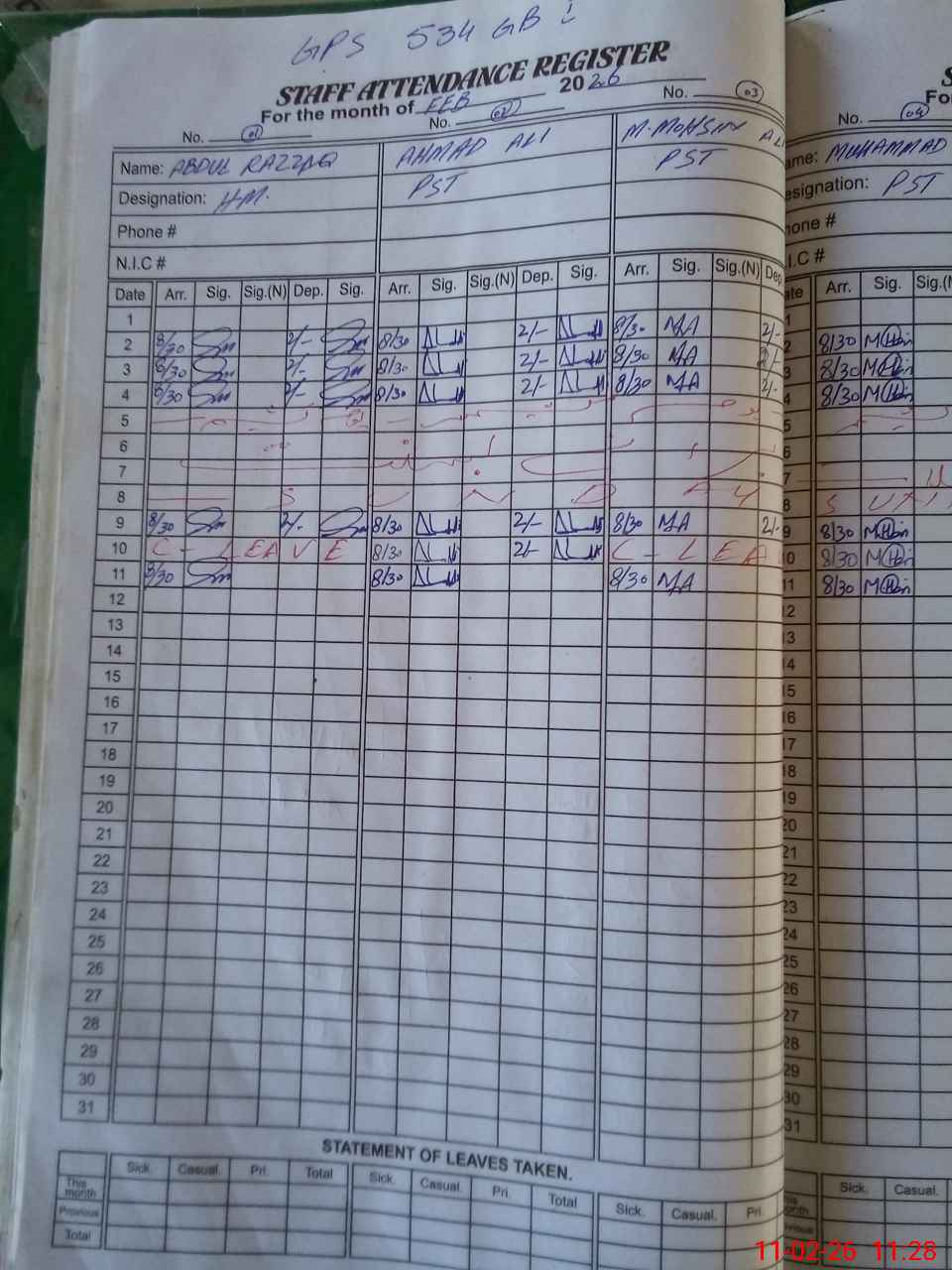 | CNIC | Full Name | Designation | R/C | Absence During Last Calender Month |