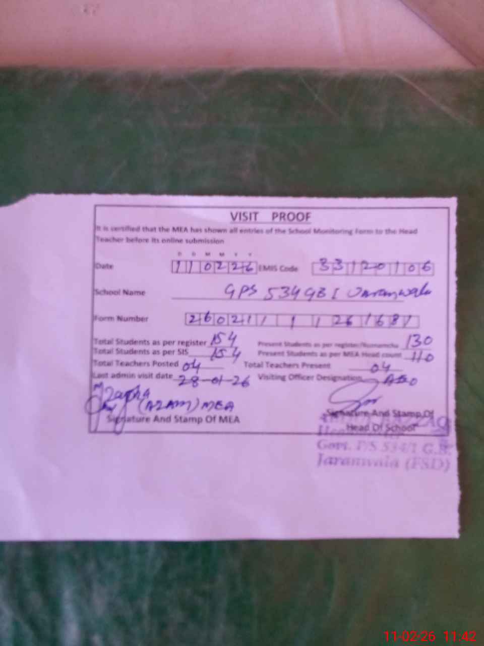 | Attendance Register | Head Teacher | MEA with School | Visit Proof |