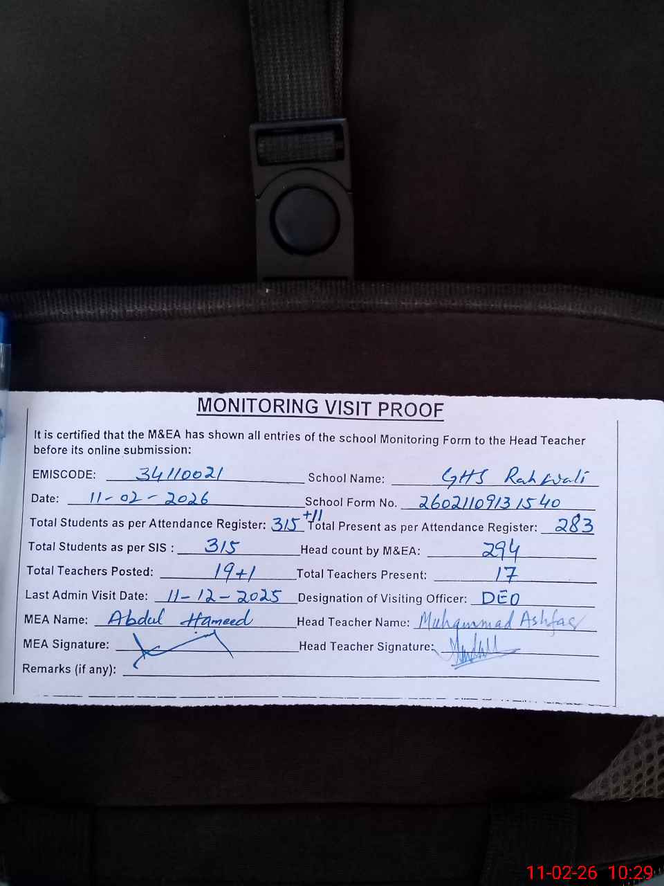 | EMIS Code: 34110021 | Name of School: GHS RAHWALI | |||