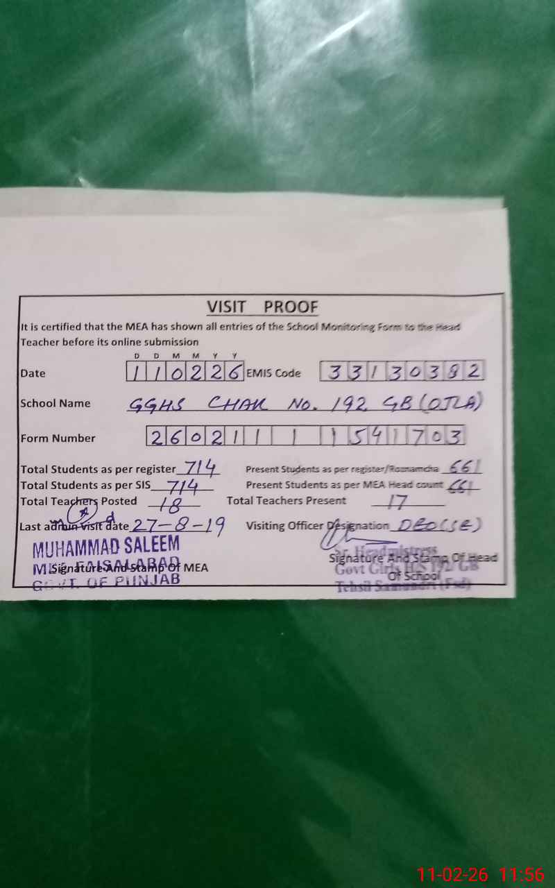 | EMIS Code: 33130382 | Name of School: GGHS CHAK NO 192 GB | |||
