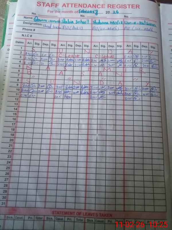 | CNIC | Full Name | Designation | R/C | Absence During Last Calender Month |