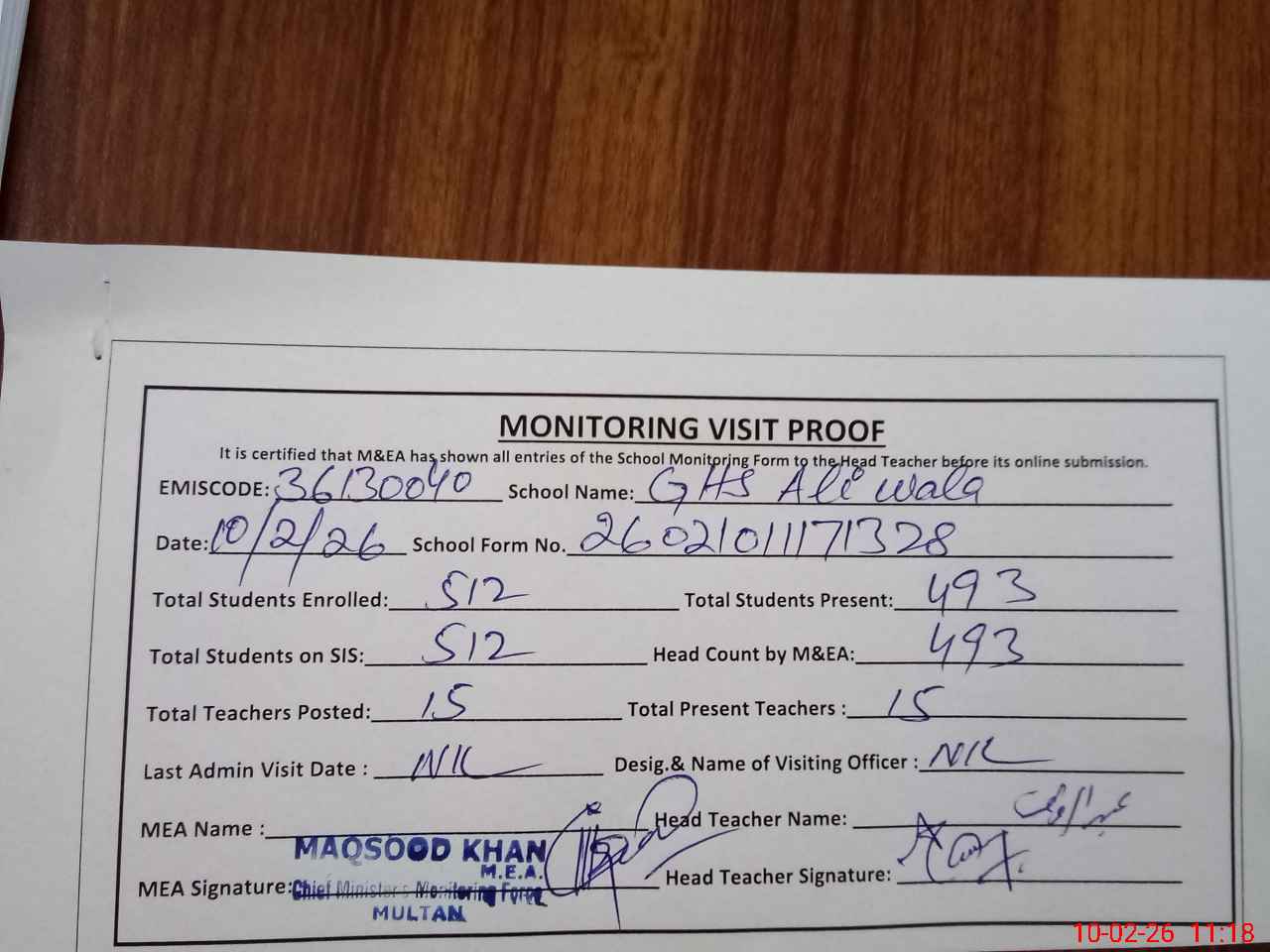 | Attendance Register | Head Teacher | MEA with School | Visit Proof |