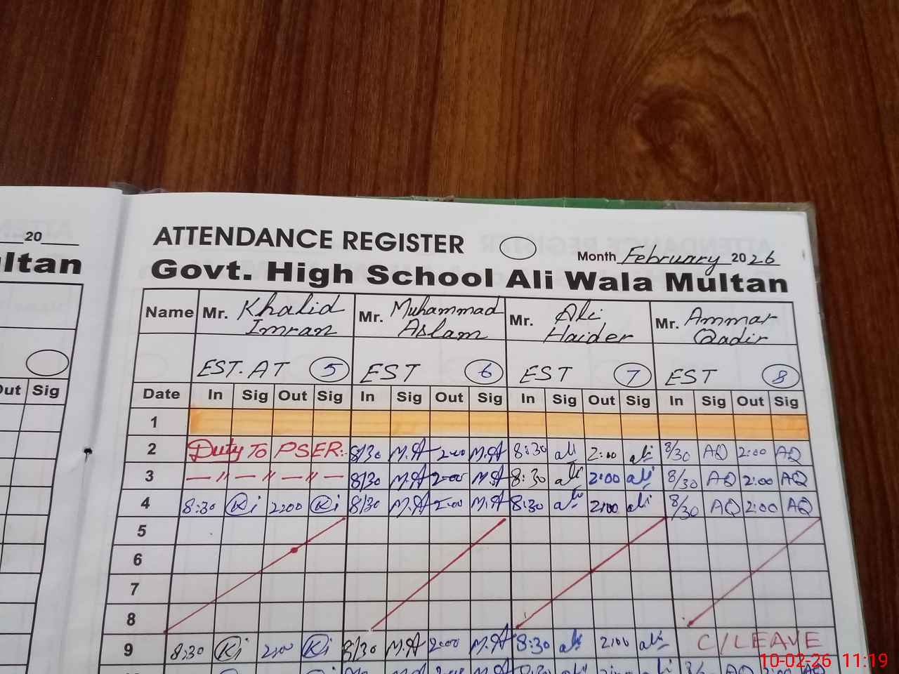 | CNIC | Full Name | Designation | R/C | Absence During Last Calender Month |