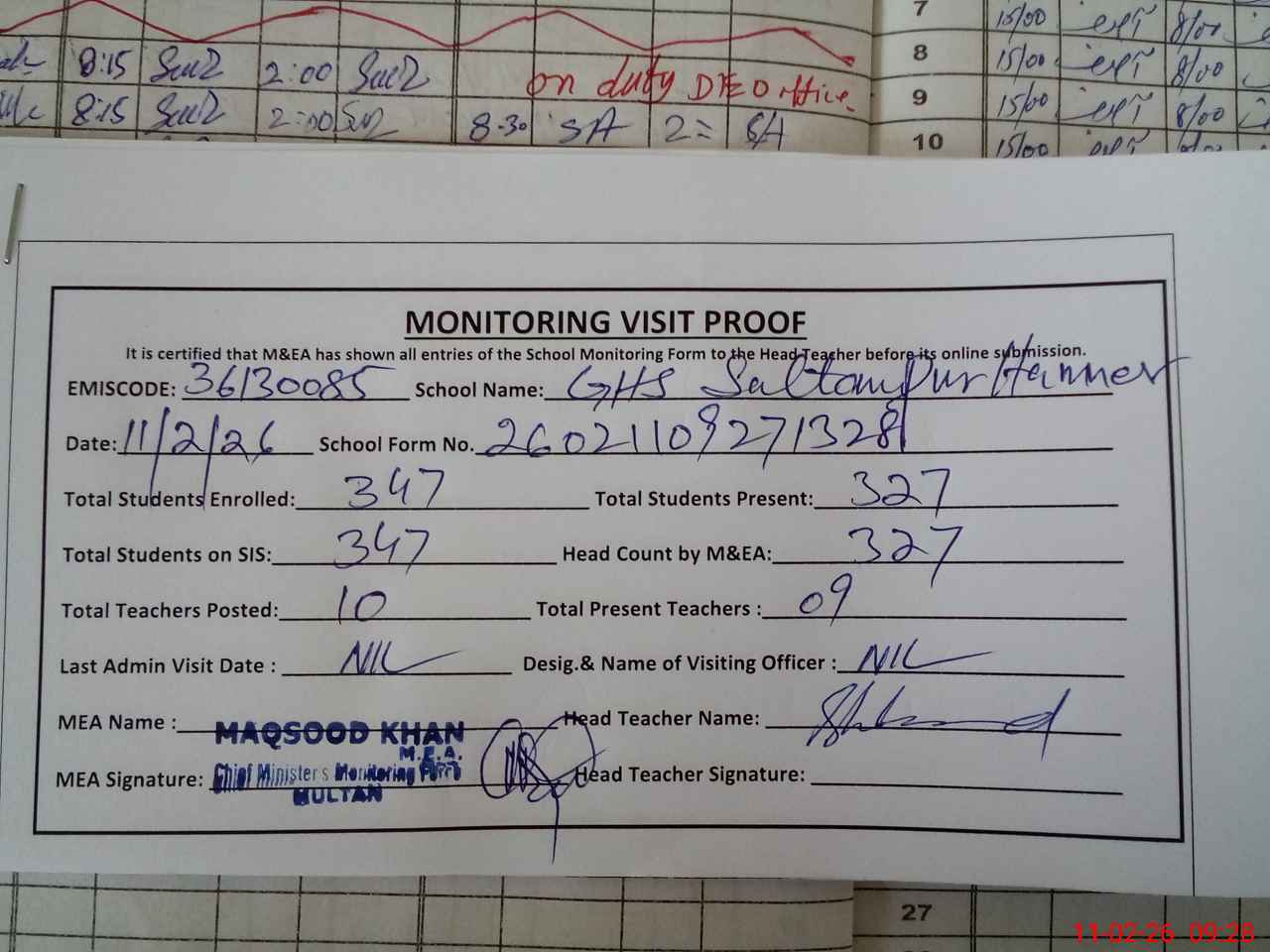| EMIS Code: 36130085 | Name of School: GHS SULTAN PUR HUMMER P/O SHER SHAH MULTAN | |||