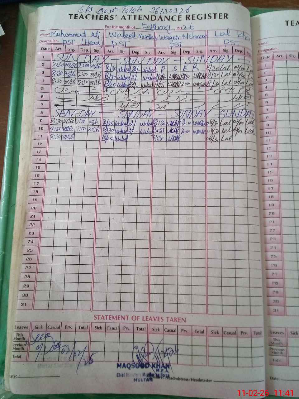| Name: MU**** AL**** Designation: (School Headmaster's/Headmistress's) HEADMASTER Phone/Cell Number: 03**** |