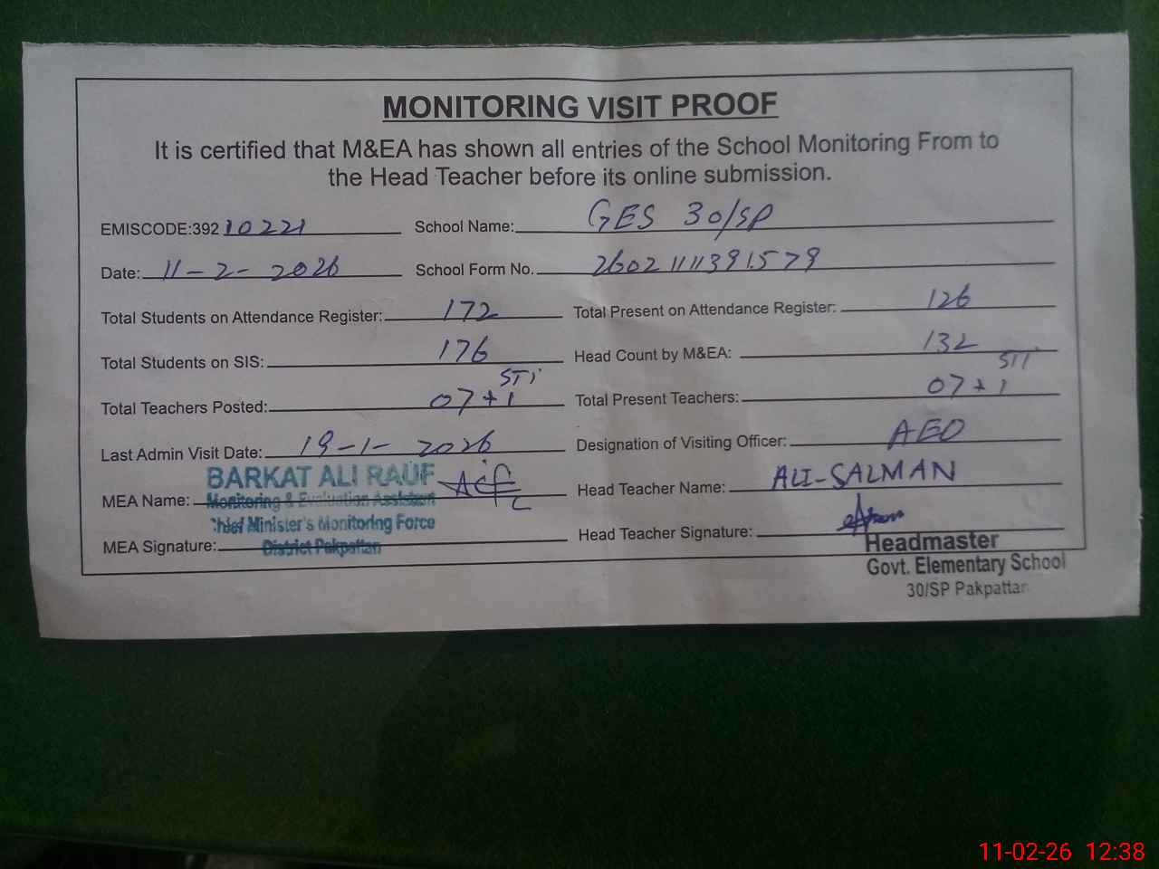 | Attendance Register | Head Teacher | MEA with School | Visit Proof |