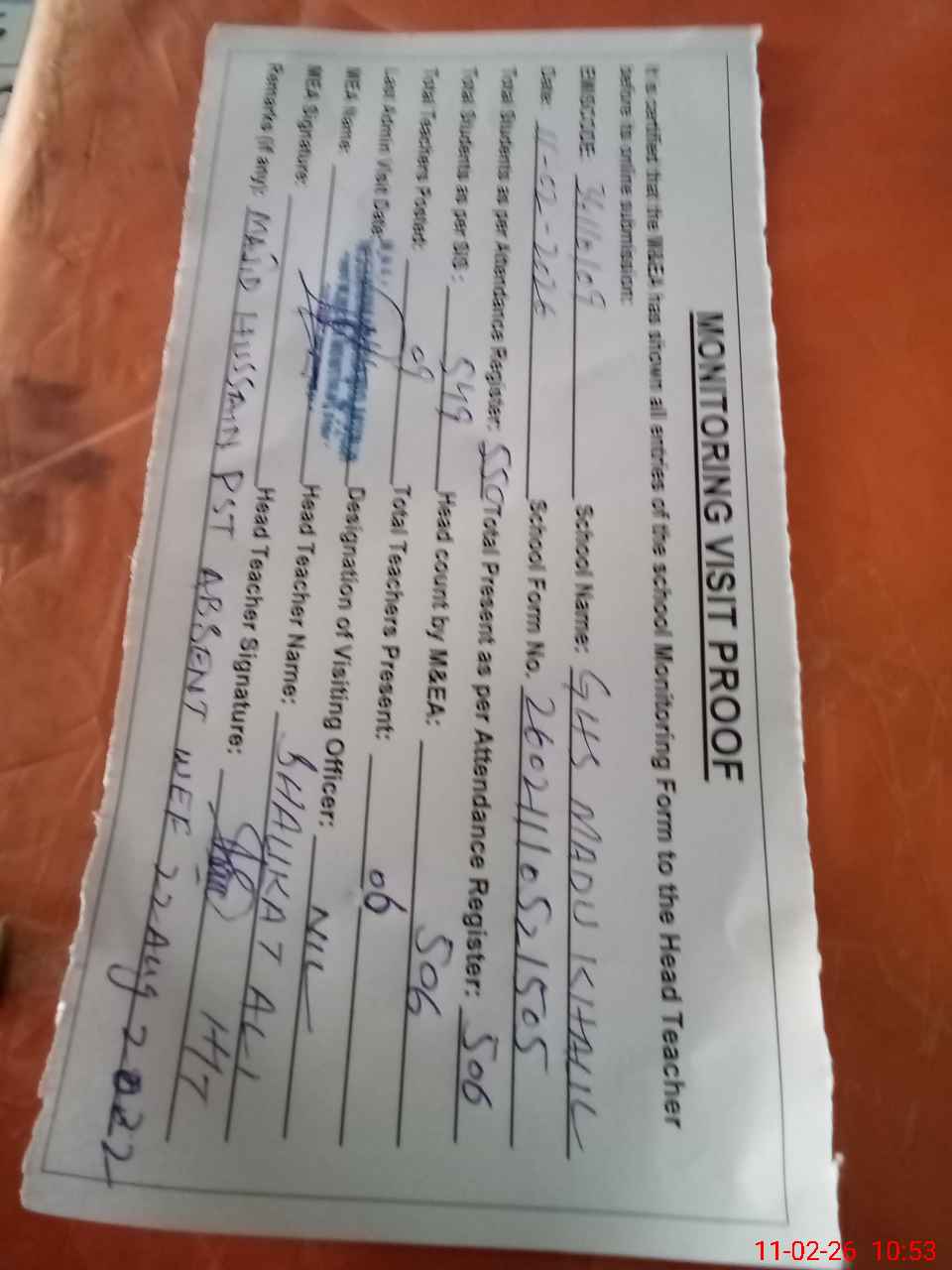 | Attendance Register | Head Teacher | MEA with School | Visit Proof |