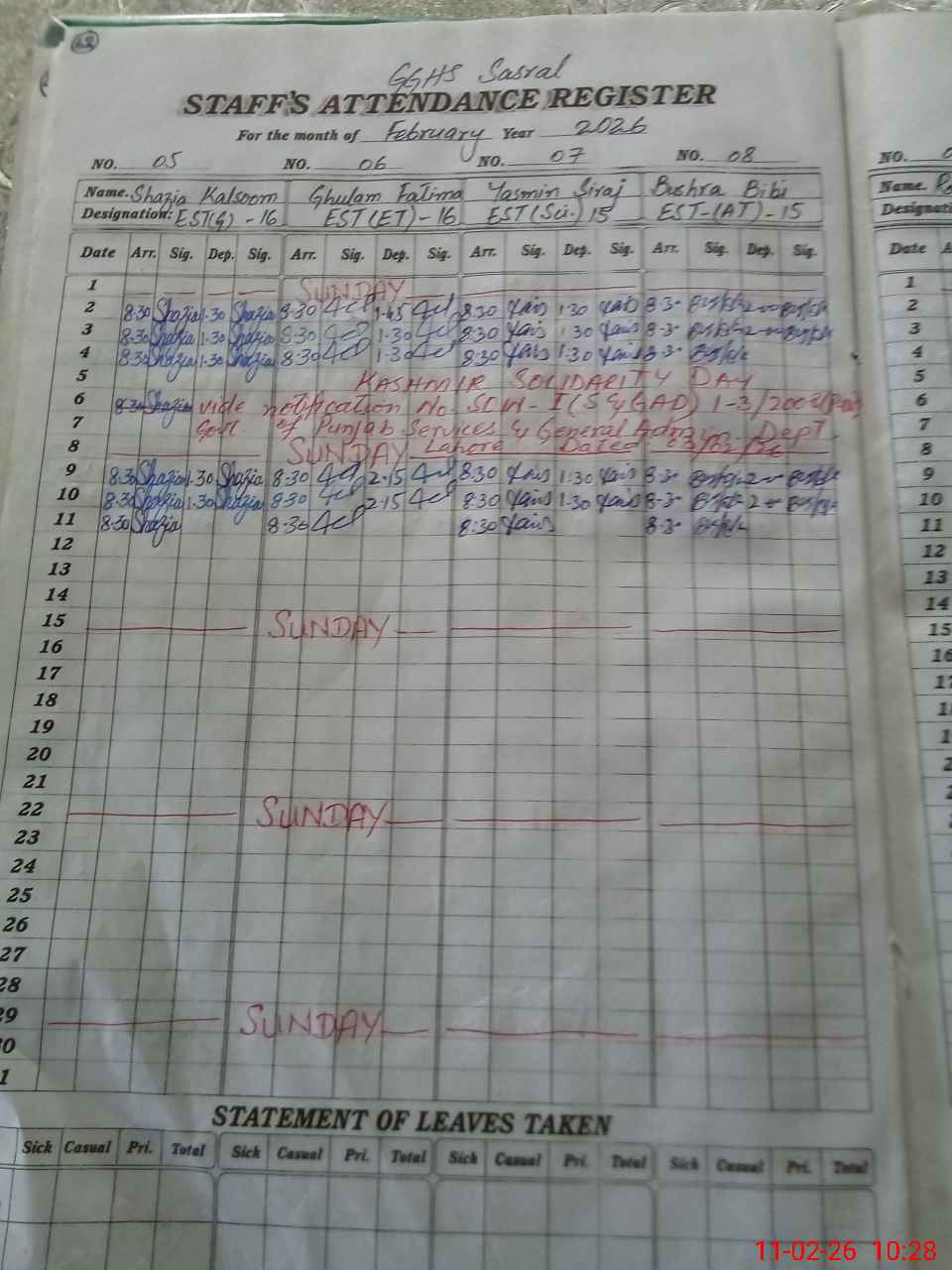 | CNIC | Full Name | Designation | R/C | Absence During Last Calender Month |