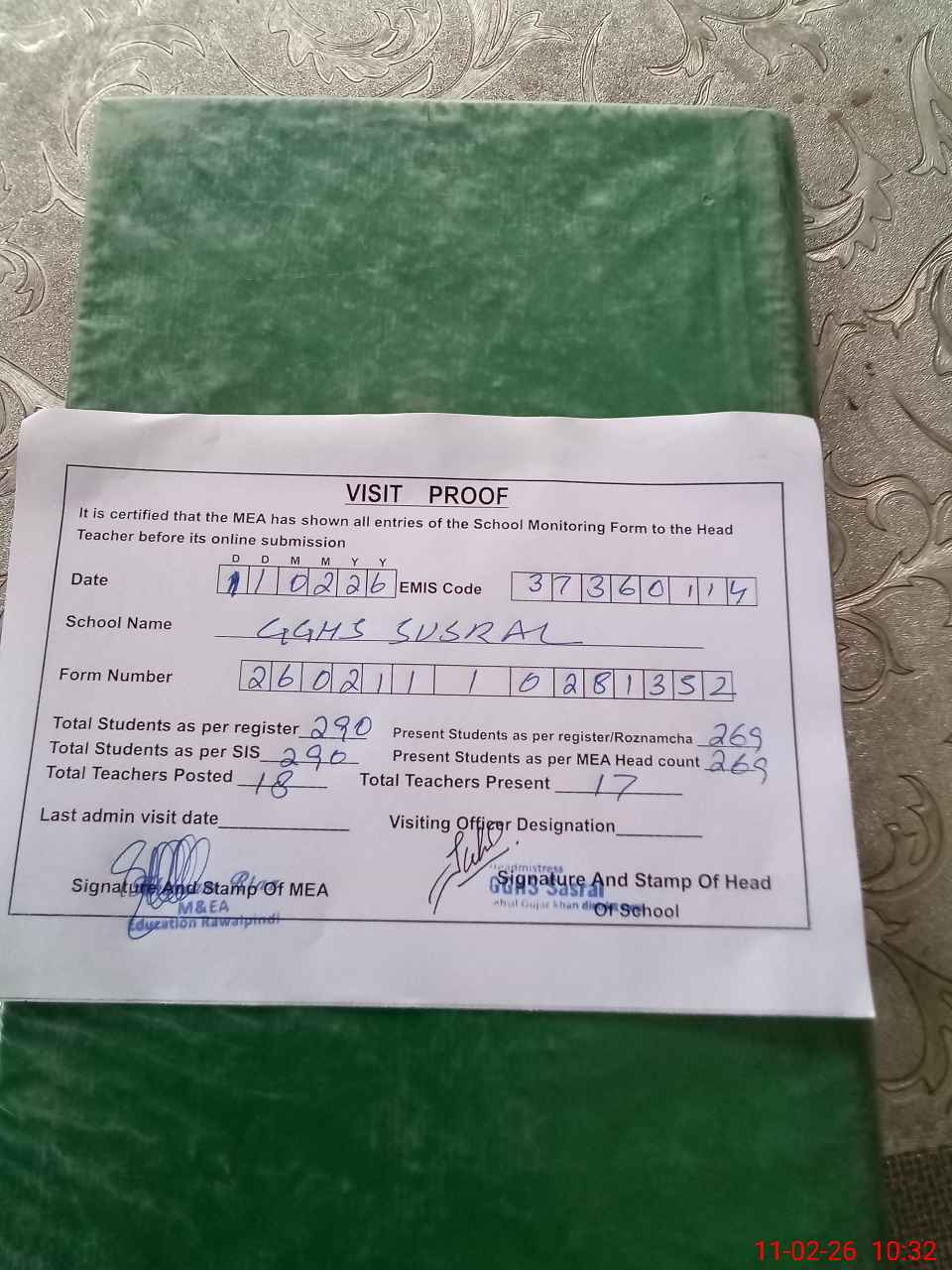 | Attendance Register | Head Teacher | MEA with School | Visit Proof |