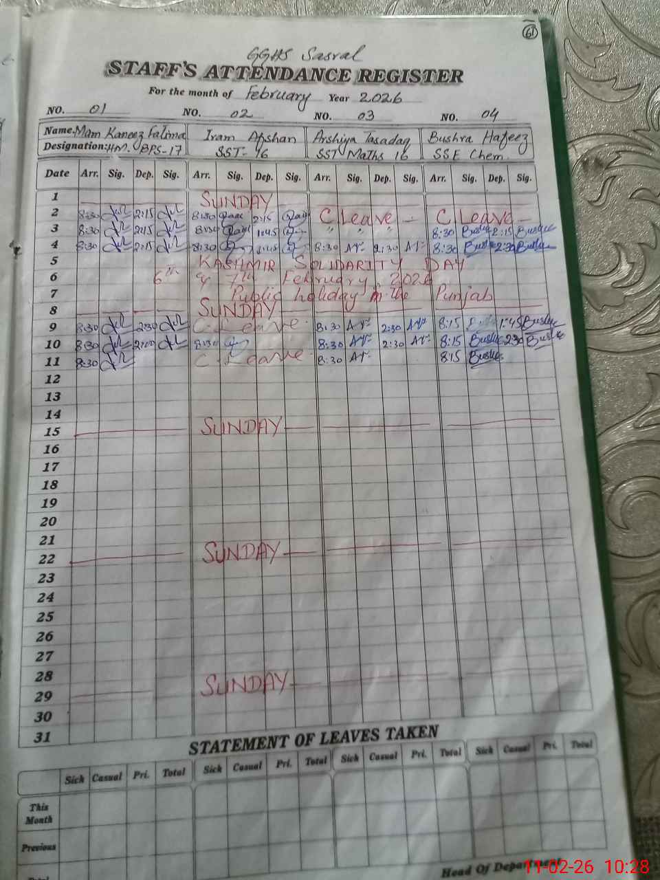 | Leave | Duty | Absent | Maternity | Medical | Ex- Pak |