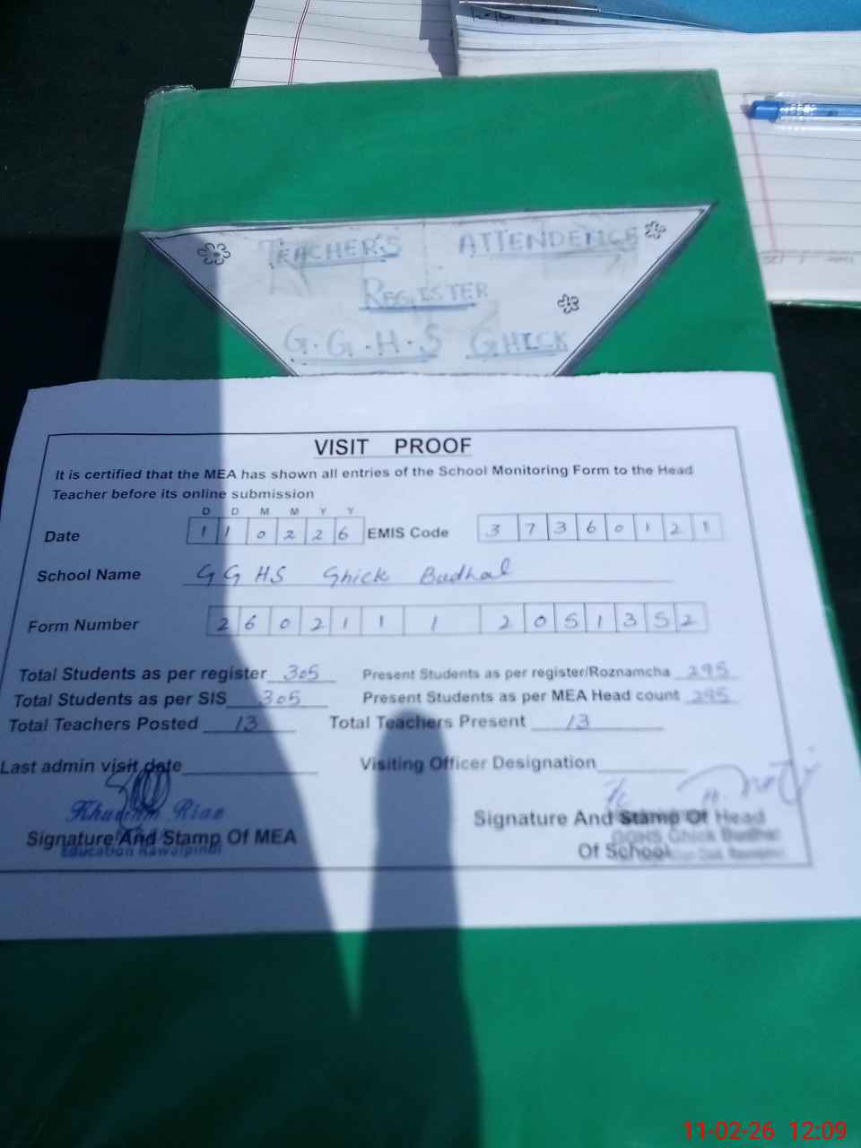 | Attendance Register | Head Teacher | MEA with School | Visit Proof |