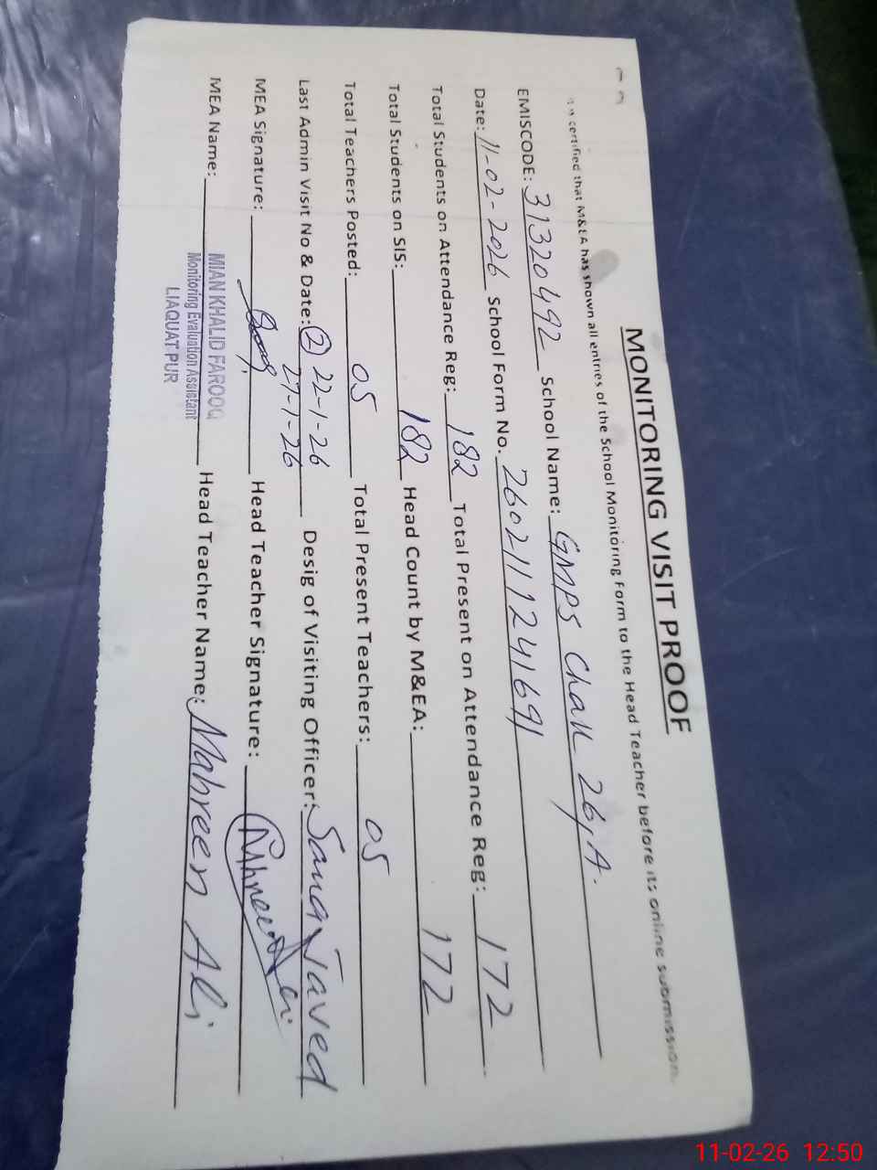 | EMIS Code: 31320492 | Name of School: GMPS CHAK NO.26/A | |||