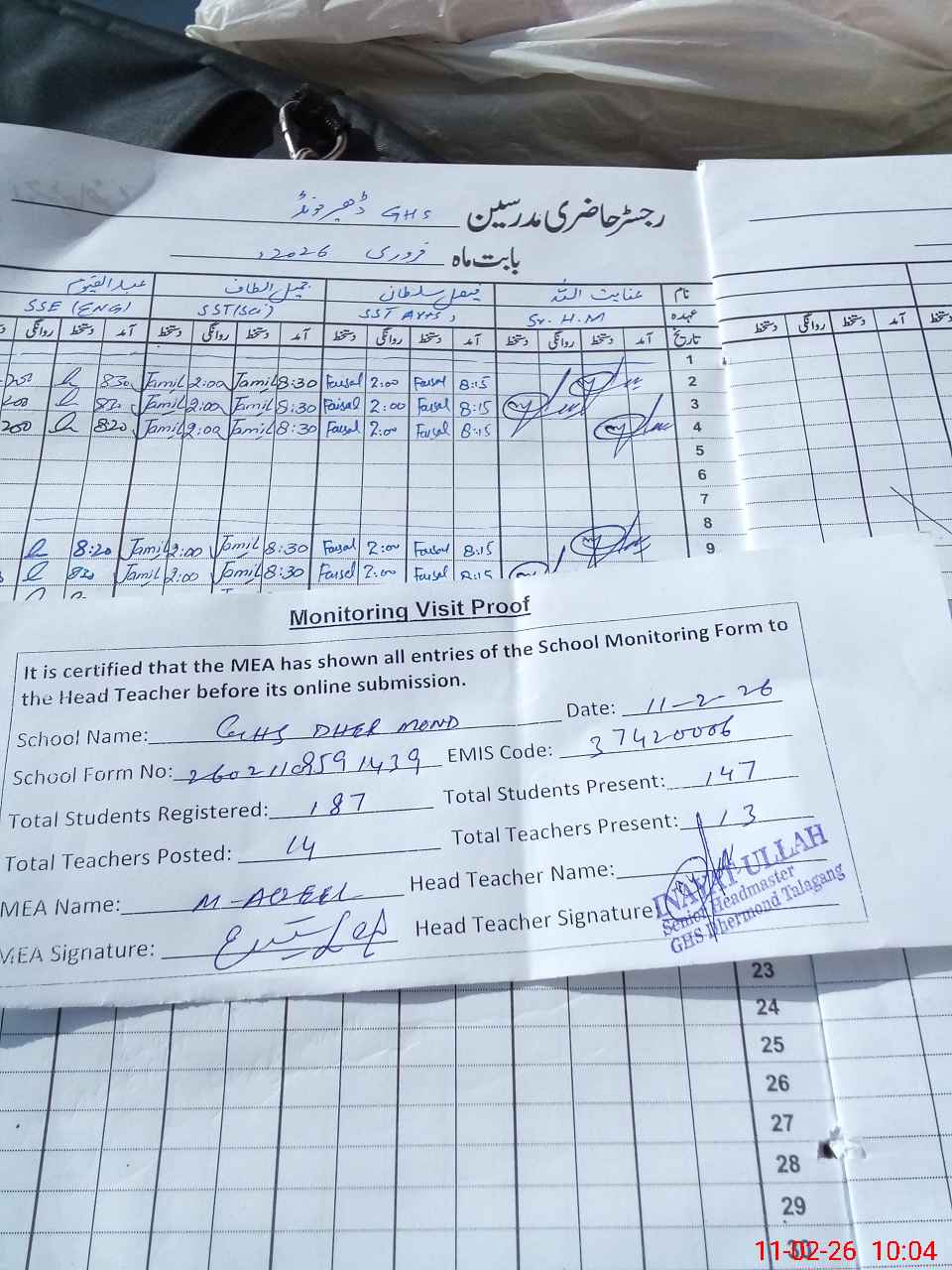 | Attendance Register | Head Teacher | MEA with School | Visit Proof |