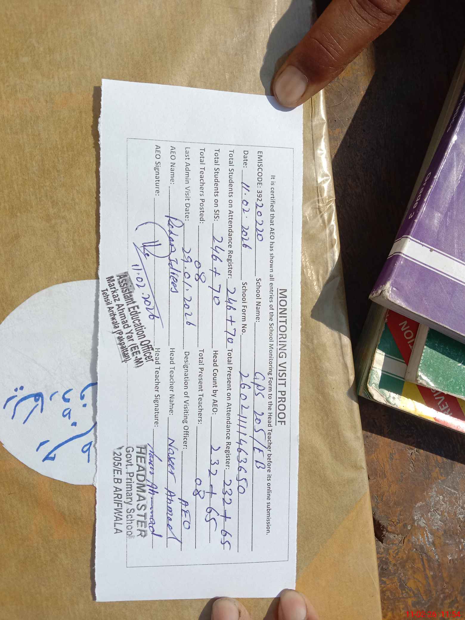 | Attendance Register | Head Teacher | MEA with School | Visit Proof |