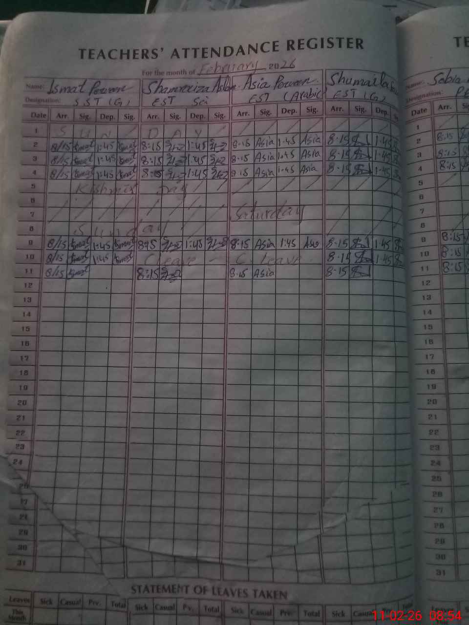 | Leave | Duty | Absent | Maternity | Medical | Ex- Pak |