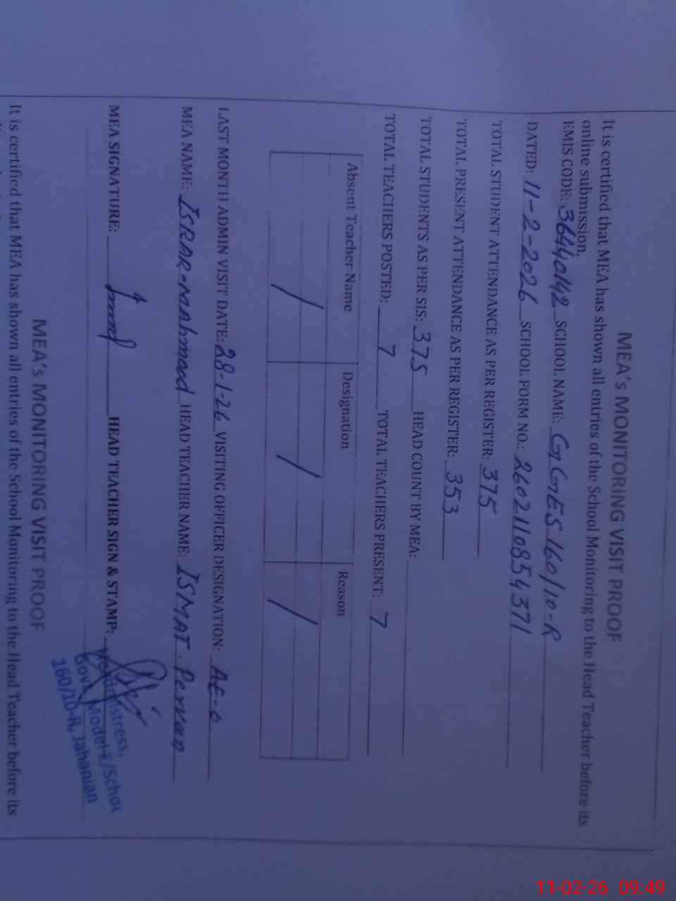 | Attendance Register | Head Teacher | MEA with School | Visit Proof |
