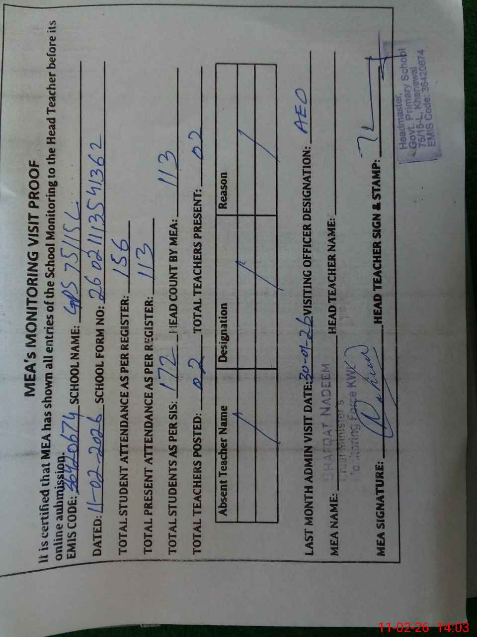| Attendance Register | Head Teacher | MEA with School | Visit Proof |
