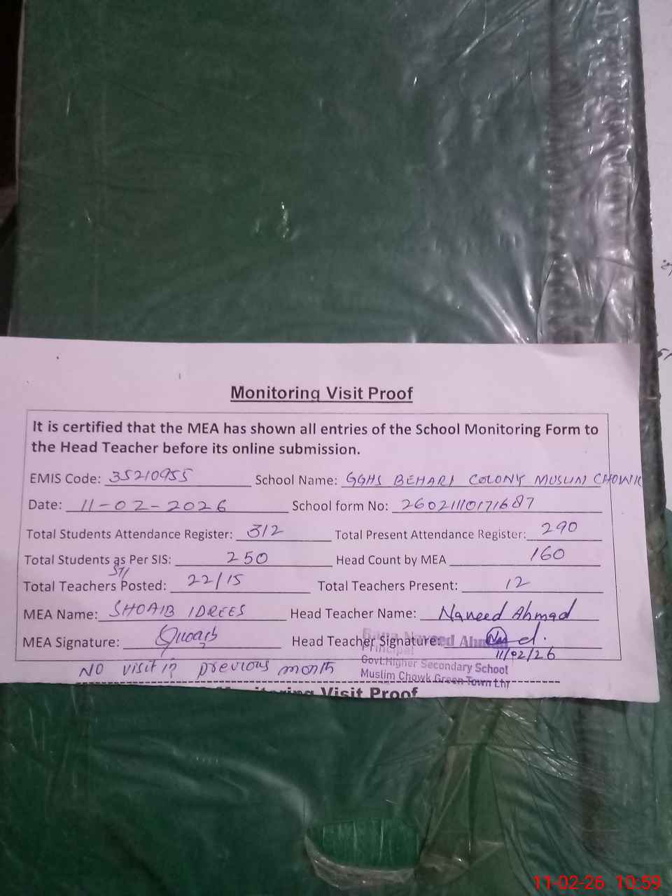 | Attendance Register | Head Teacher | MEA with School | Visit Proof |