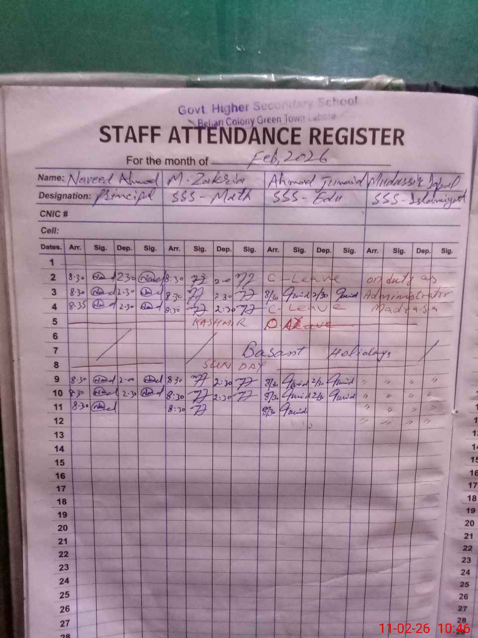 | CNIC | Full Name | Designation | R/C | Absence During Last Calender Month |