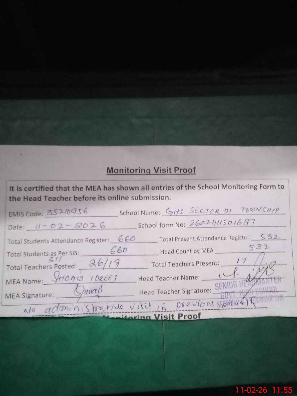 | Attendance Register | Head Teacher | MEA with School | Visit Proof |