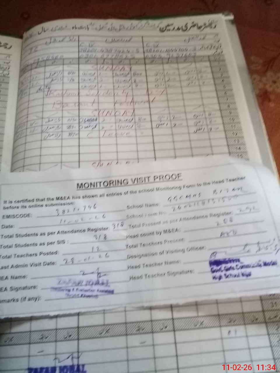 | Attendance Register | Head Teacher | MEA with School | Visit Proof |