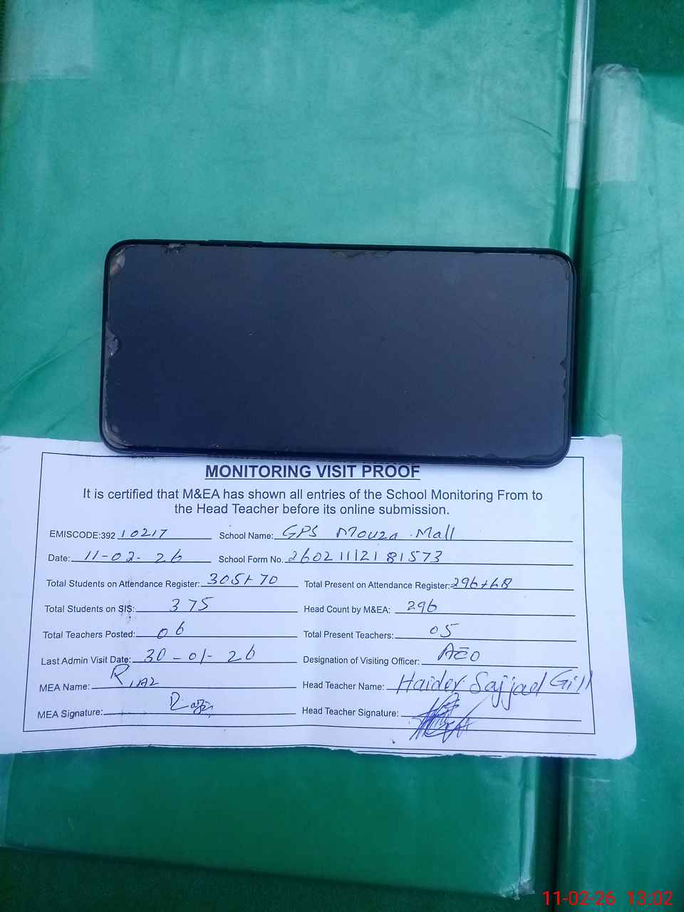 | Attendance Register | Head Teacher | MEA with School | Visit Proof |