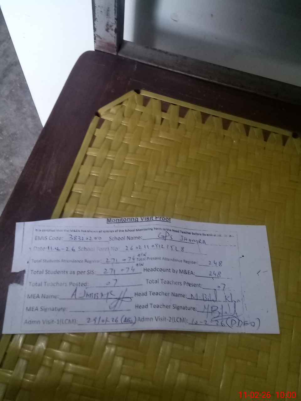 | Attendance Register | Head Teacher | MEA with School | Visit Proof |