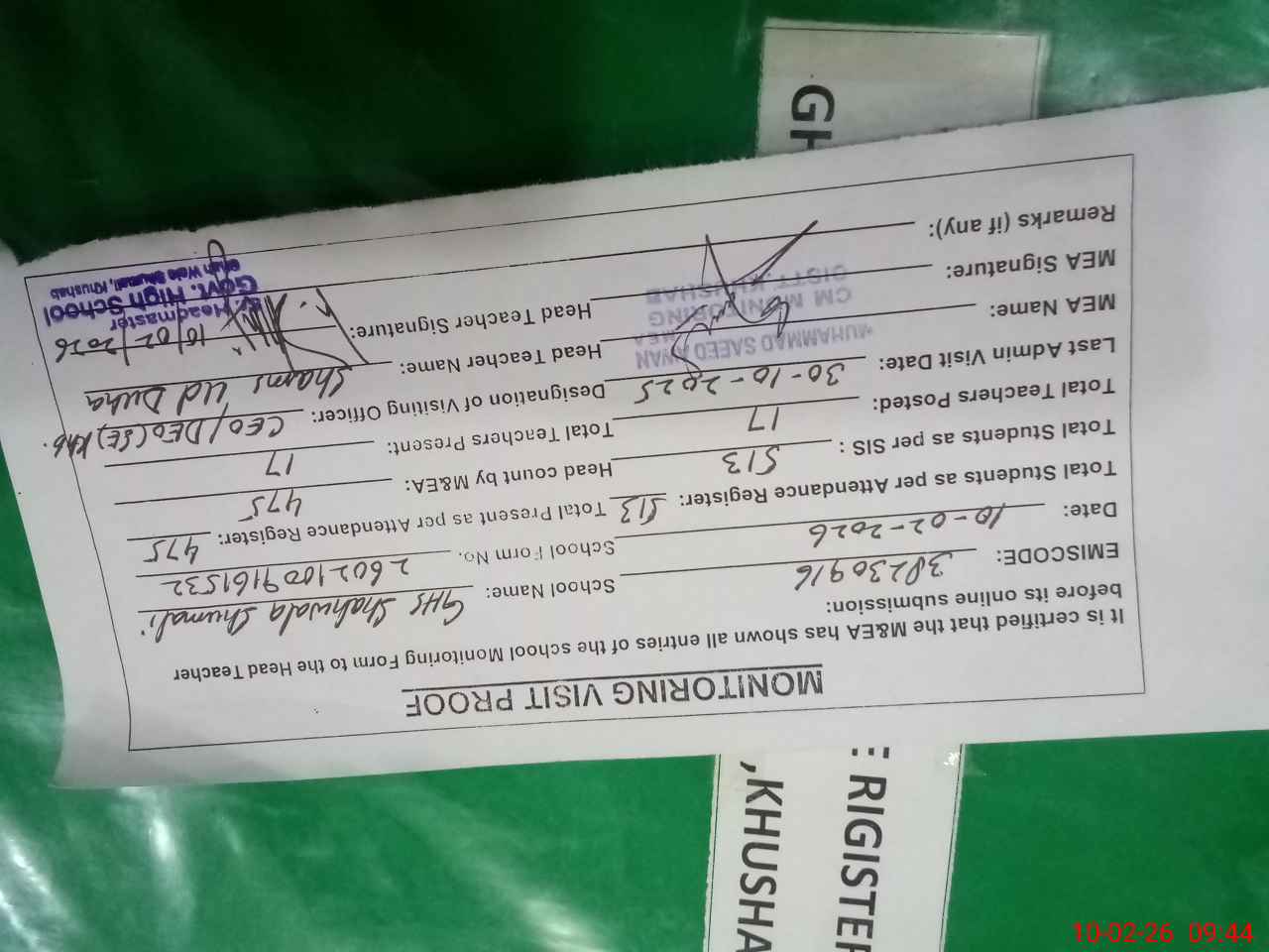 | Remarks (Use Separate Page if Required): Students on SIS Qty 513 Last admin visit On 30 October 2025 by CEO/ DEO.SE | |||||