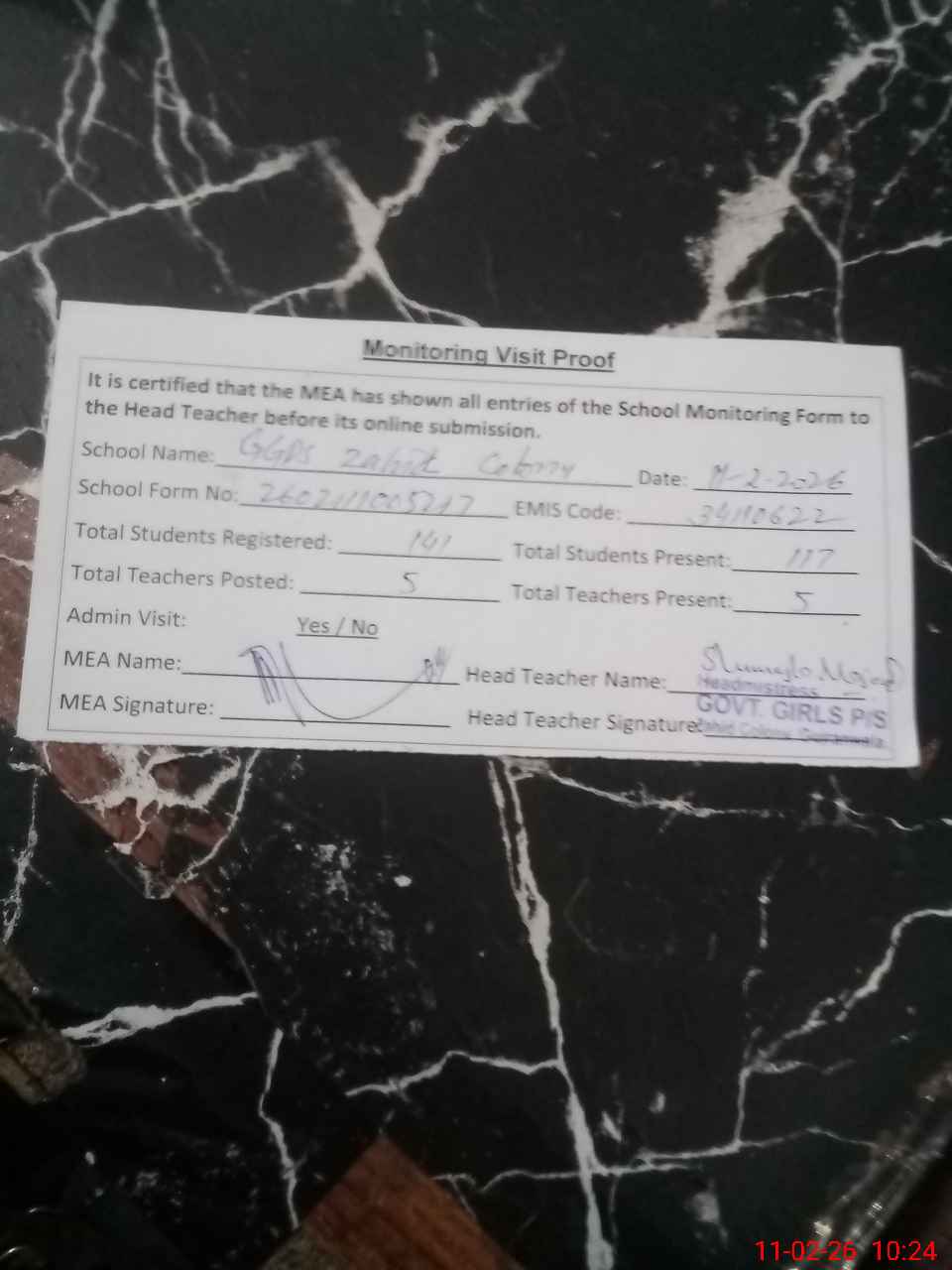 | Attendance Register | Head Teacher | MEA with School | Visit Proof |