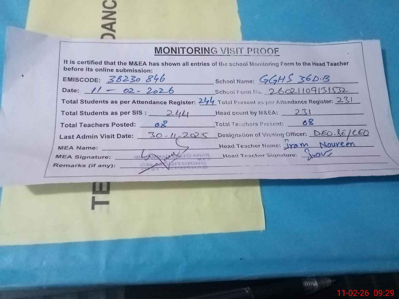 | Attendance Register | Head Teacher | MEA with School | Visit Proof |