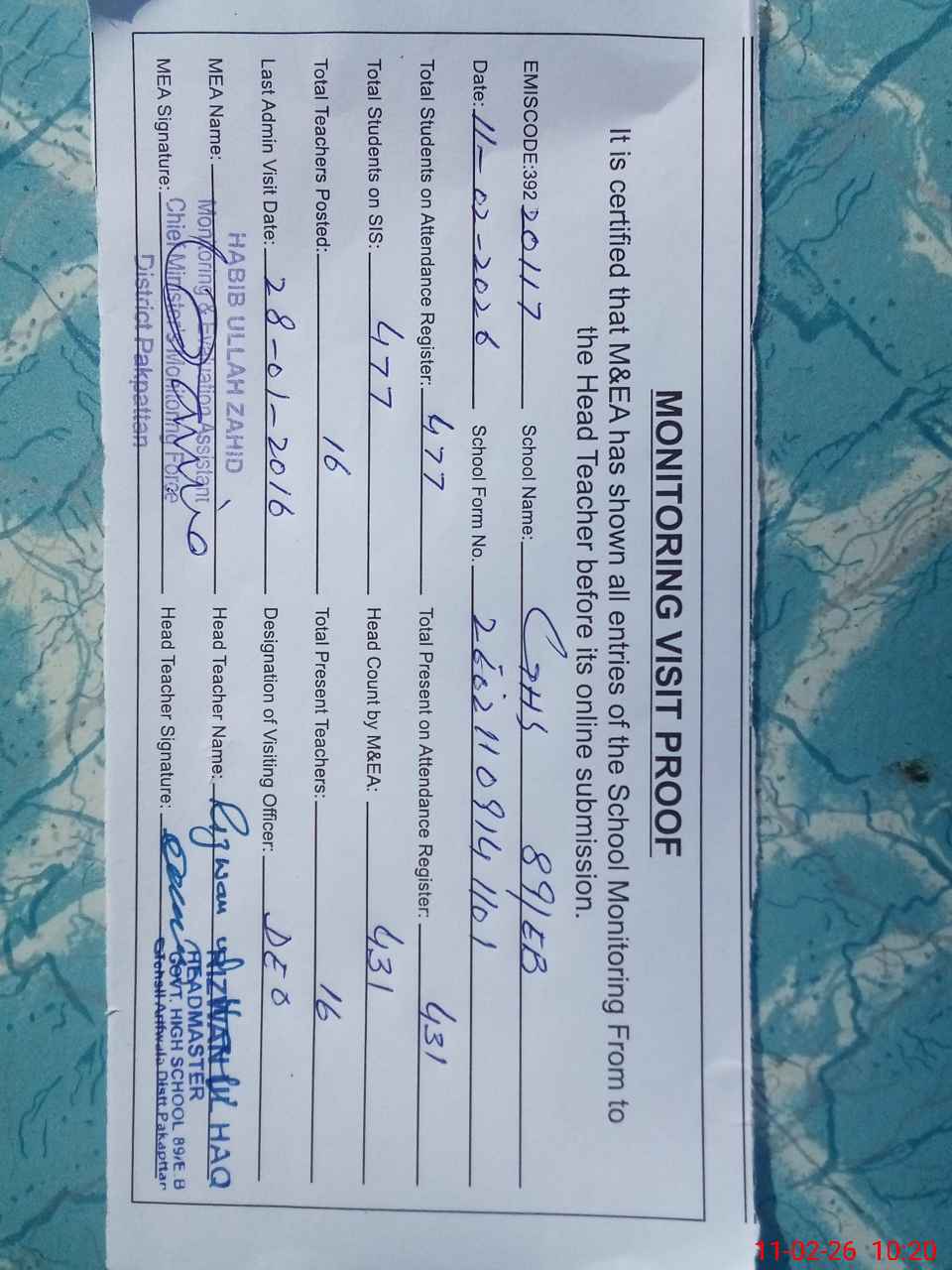 | Certified that this School was Inspected by the Undersigned MEA/DMO Today and the Information Stated Above is as Per Record. | |||||