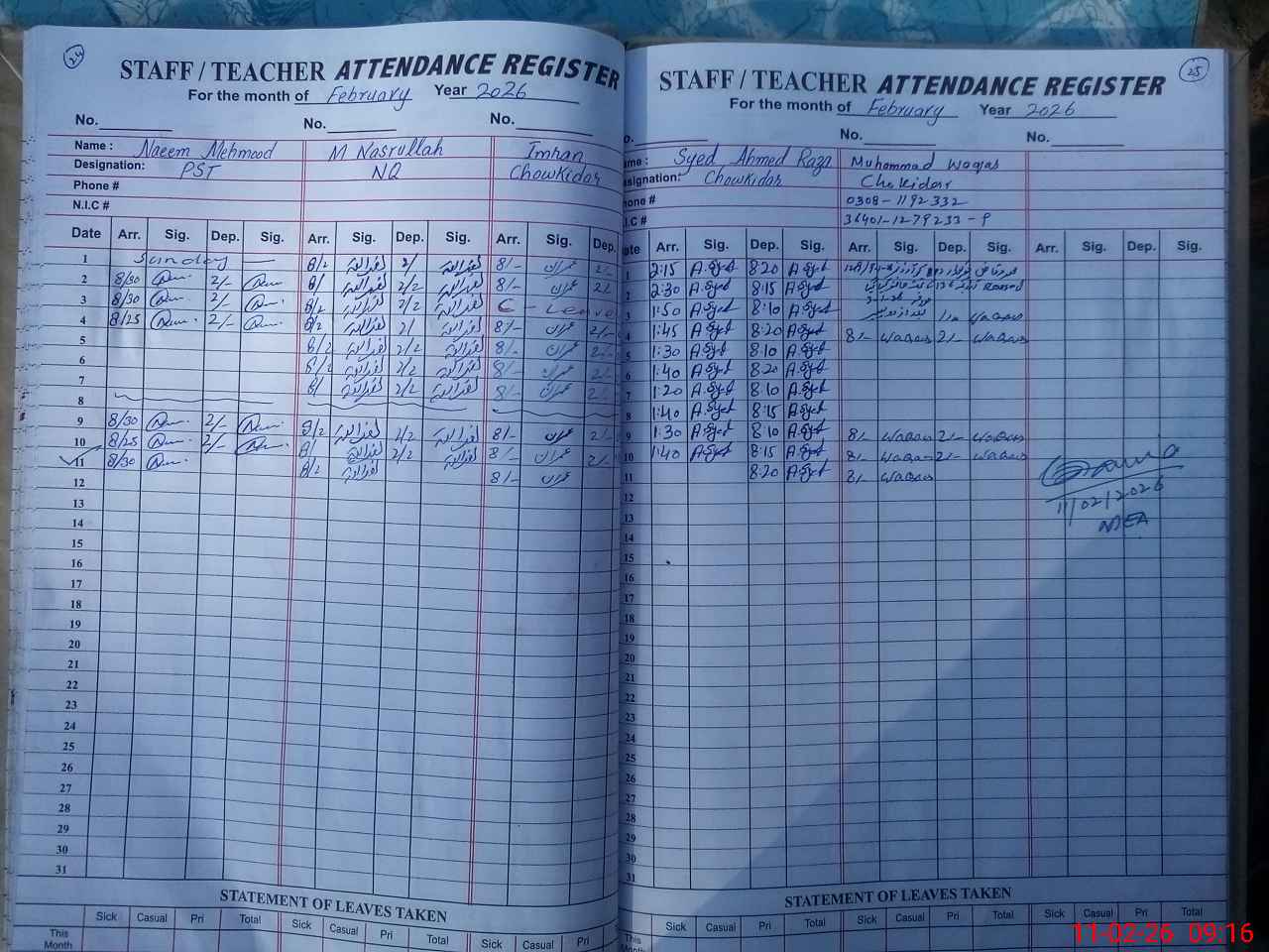 | CNIC | Full Name | Designation | R/C | Absence During Last Calender Month |