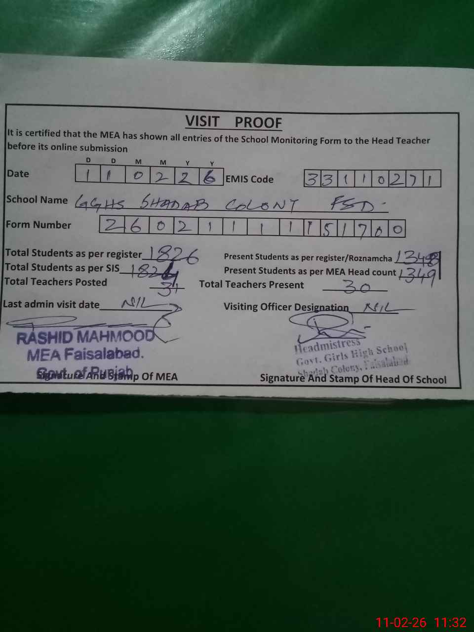 | Attendance Register | Head Teacher | MEA with School | Visit Proof |