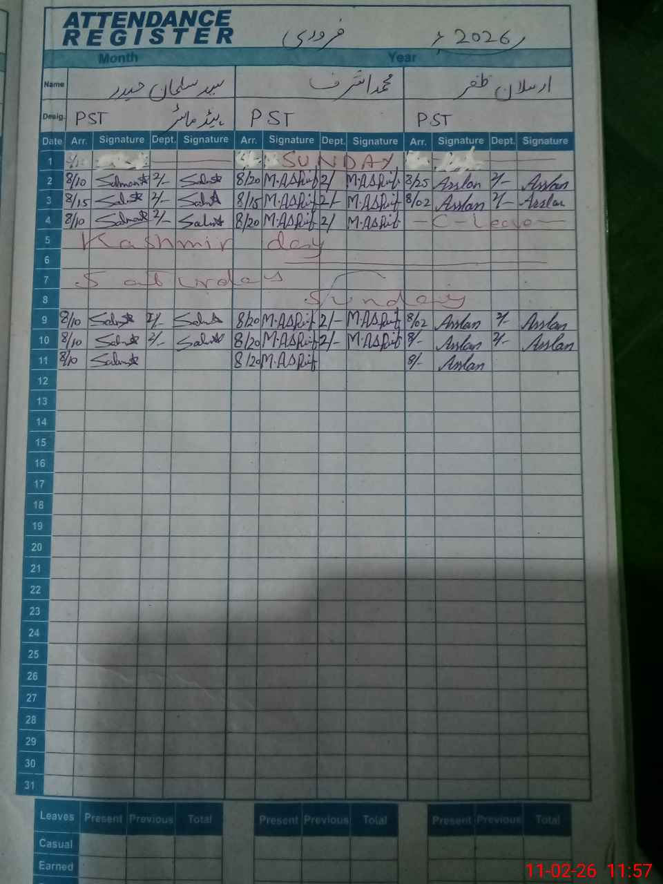 | CNIC | Full Name | Designation | R/C | Absence During Last Calender Month |