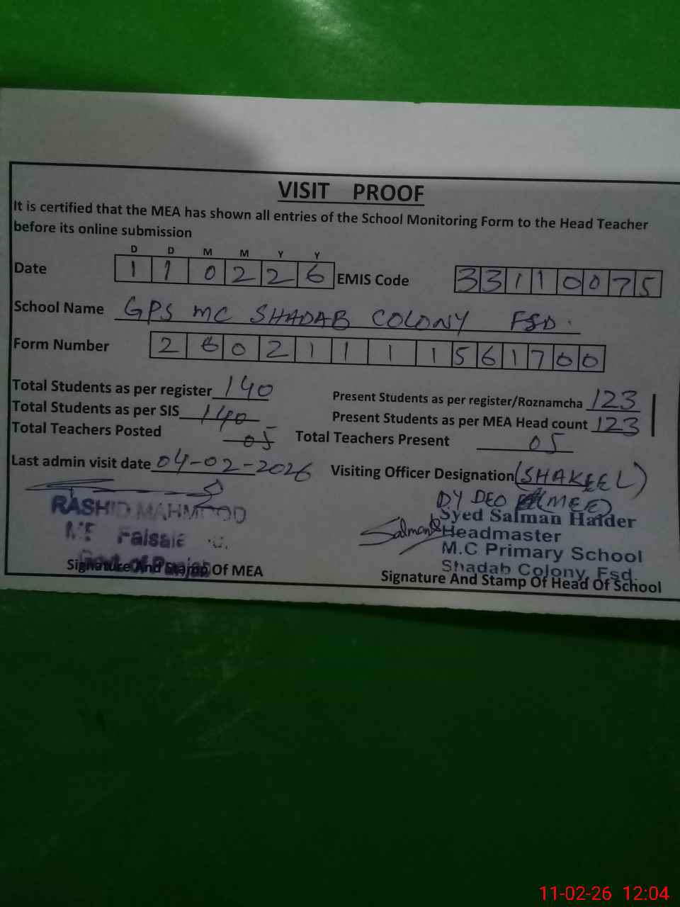 | Attendance Register | Head Teacher | MEA with School | Visit Proof |