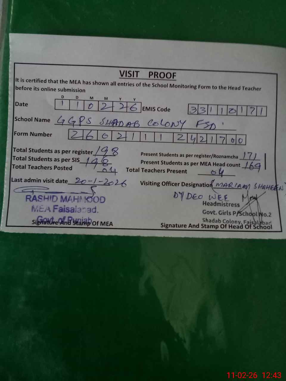 | EMIS Code: 33110171 | Name of School: GGPS SHADAB COLONY 2 | |||
