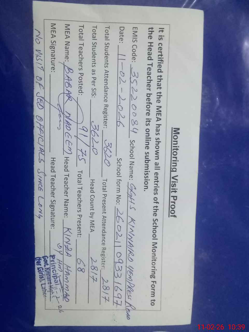 | Certified that this School was Inspected by the Undersigned MEA/DMO Today and the Information Stated Above is as Per Record. | |||||
