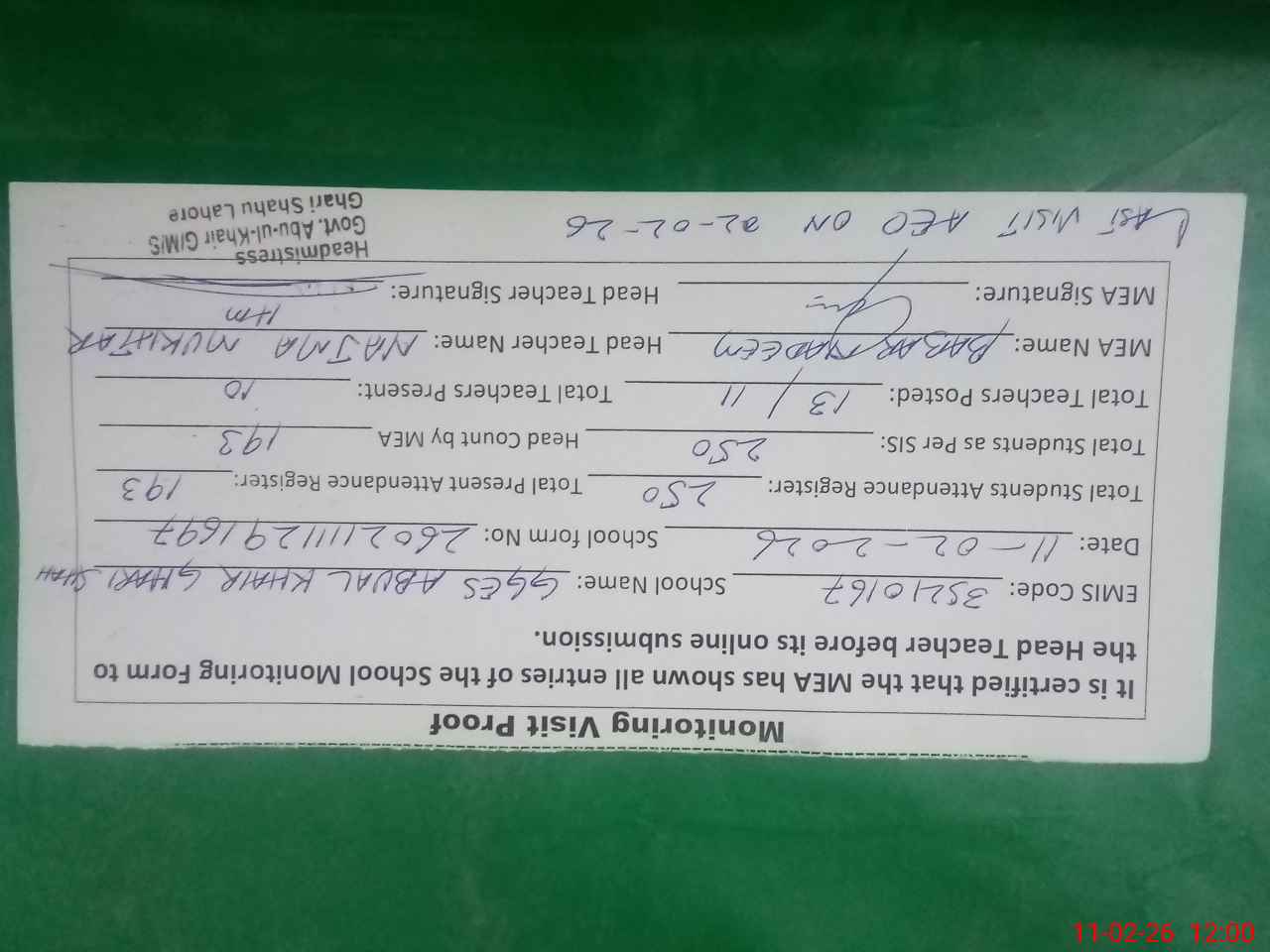 | Certified that this School was Inspected by the Undersigned MEA/DMO Today and the Information Stated Above is as Per Record. | |||||
