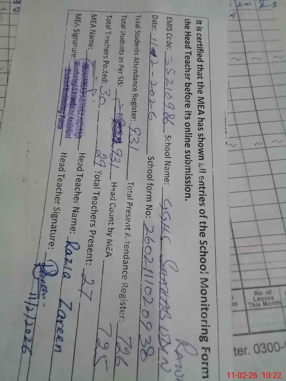 | Monitoring Date: 11-02-2026 | Start Time: 11-02-2026 09:20 AM | End Time: 11-02-2026 10:22 AM | Name of MEA: M.**** AK**** | |