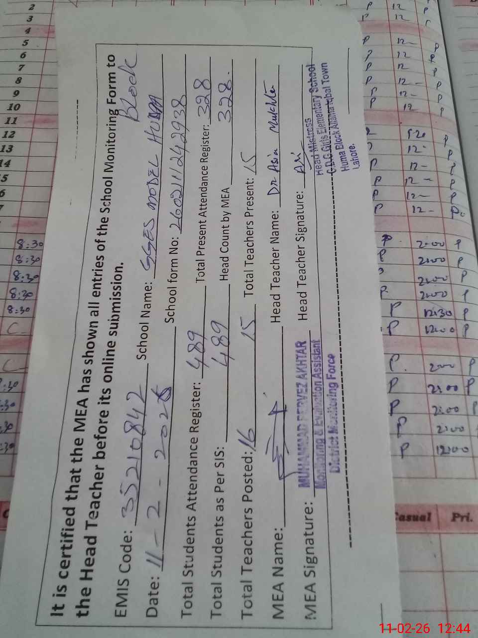 | EMIS Code: 35210842 | Name of School: GGES MODEL HUMA BLOCK IQBAL TOWN (Ex-MCL) | |||